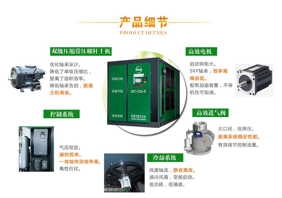 采用德國(guó)薩震空壓機(jī)主機(jī),無振動(dòng),低噪音,大轉(zhuǎn)子,低轉(zhuǎn)速,強(qiáng)大的心臟決定了整機(jī)的優(yōu)異性能。轉(zhuǎn)子經(jīng)嚴(yán)格的動(dòng), 靜平衡試驗(yàn), 使其運(yùn)轉(zhuǎn)平衡更好, 振動(dòng)更小, 噪聲更低,同時(shí)在直徑不變的情況下,轉(zhuǎn)子長(zhǎng)度增加,有效壓縮面積增加,從而達(dá)到流量增加,功耗降低。
