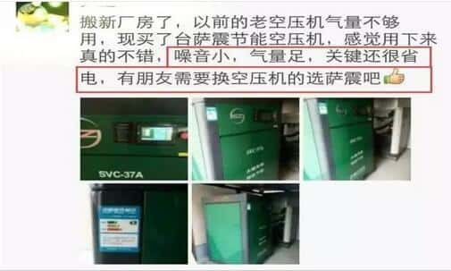 該客戶用過一段時間后,是這樣說的:“搬新廠房了,以前的老空壓機氣量不夠用,現(xiàn)買了臺薩震節(jié)能空壓機,感覺用下來真的不錯,噪音小,氣量足,關鍵還很省電,有朋友需要換空壓機的選薩震吧。”