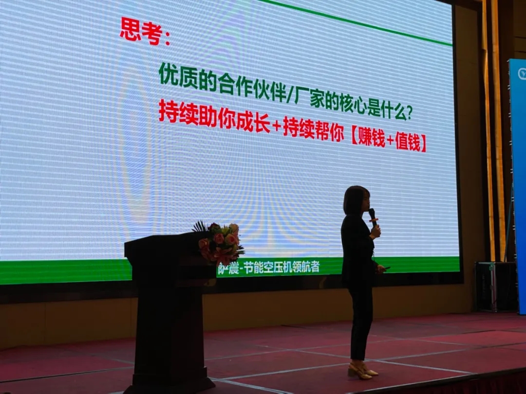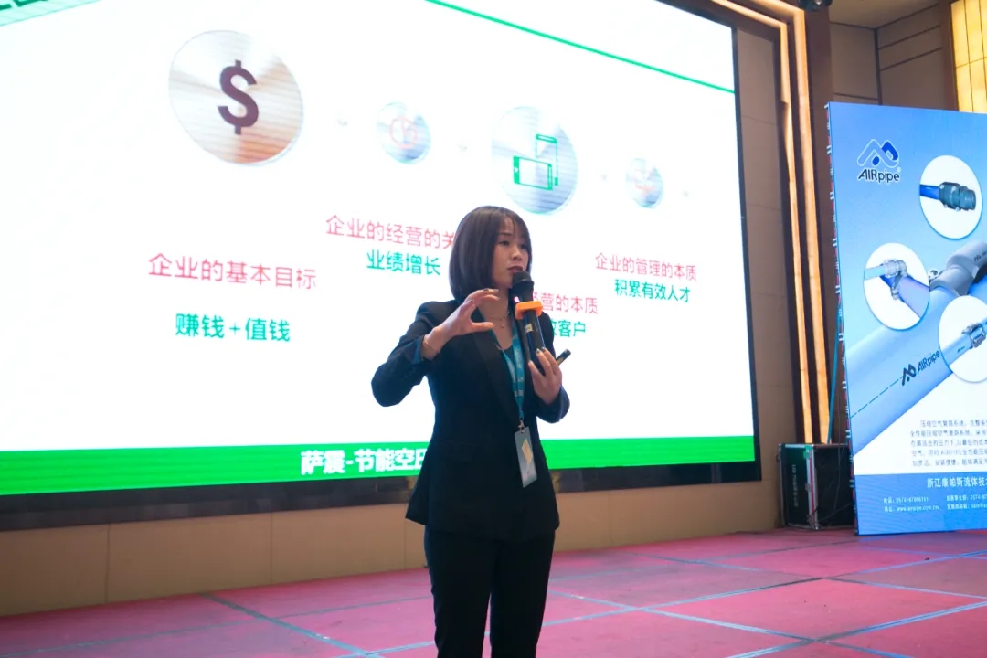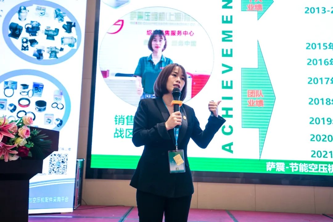 緊接著,各廠商依次向參會嘉賓分享各自的技術(shù)和產(chǎn)品,薩震壓縮機(上海)有限公司的南區(qū)副總?cè)A芬珍在PPT中,從企業(yè)文化、團隊管理、產(chǎn)品特性等方面以飽滿的精神做出了精彩的分享。