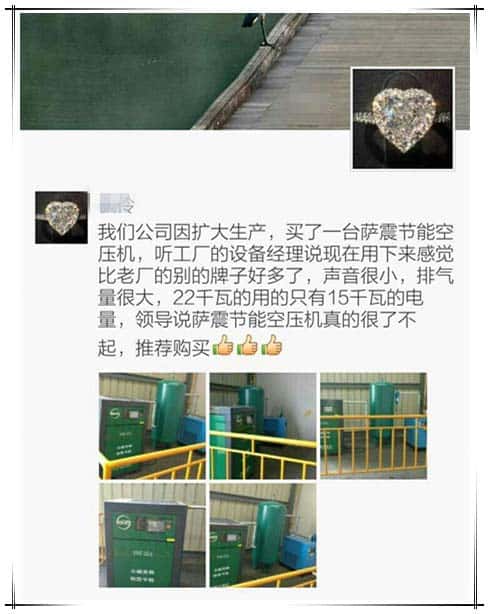 客戶如是說:我們公司因擴(kuò)大生產(chǎn),買了一臺薩震節(jié)能空壓機(jī),聽工廠的設(shè)備經(jīng)理說現(xiàn)在用下來感覺比老廠的別的牌子好多了,聲音很小,排氣量很大,22千瓦的用的只有15千瓦的電量,領(lǐng)導(dǎo)說薩震節(jié)能空壓機(jī)真的很了不起,推薦購買。